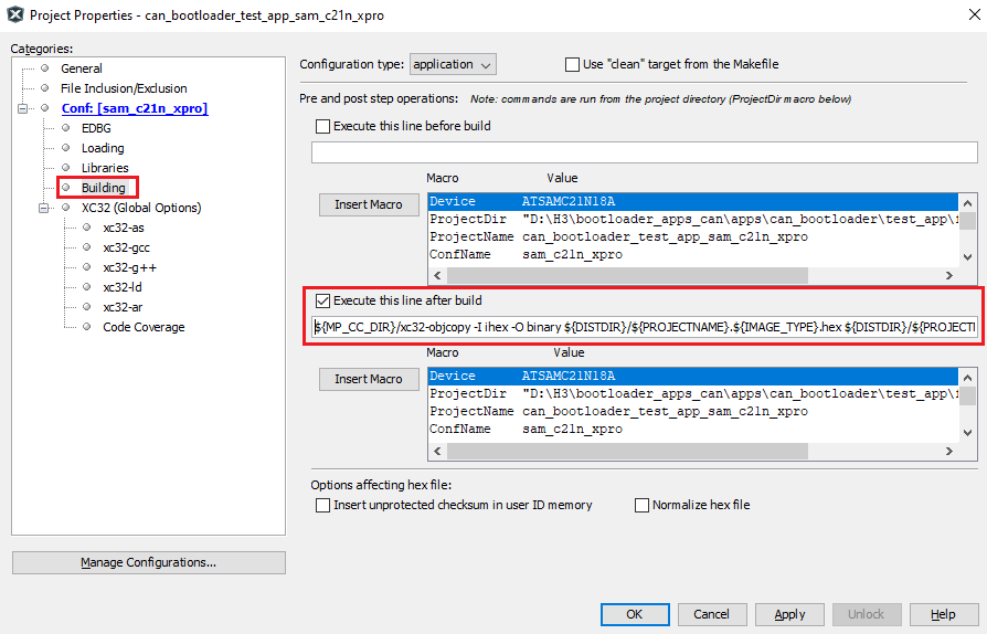 - The Application Start Address (Hex) will be used to generate XC32 compiler settings to place the code at intended address