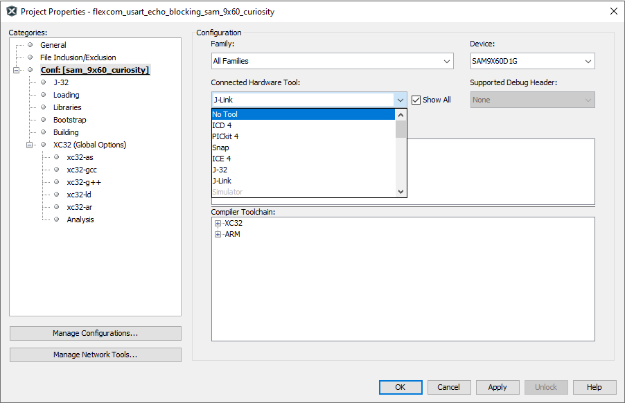 configuration option --> connected hardware tools, select the debugger.Note: if no debugger is connected, click on the "show all" check box and select the supported debugger.