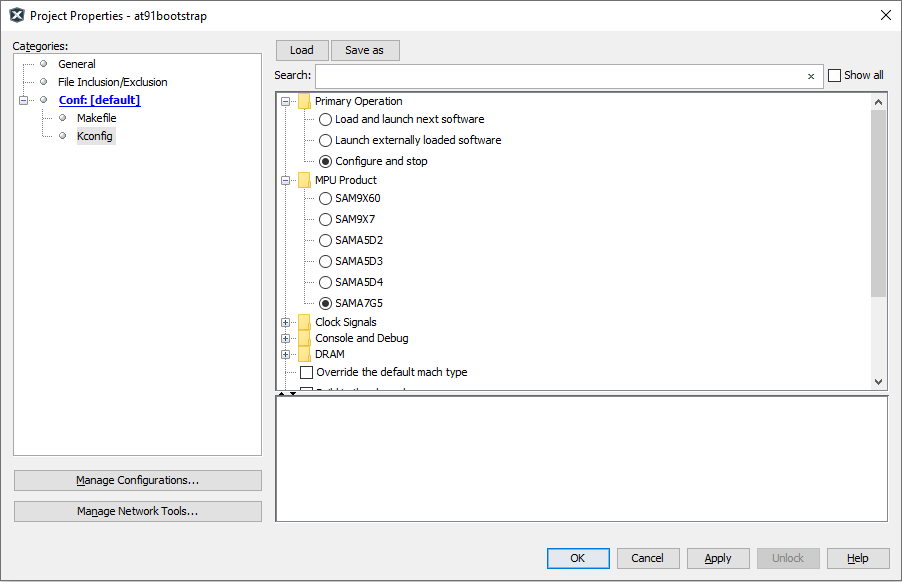 - Load {evaluation_kit}_bkpt_none_defconfig. For example, on SAMA7G5 Evaluation Kit, select sama7g5ek_bkptnone_defconfig as the configuration file.
