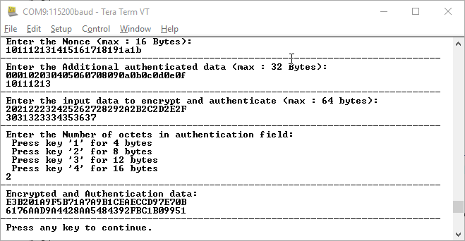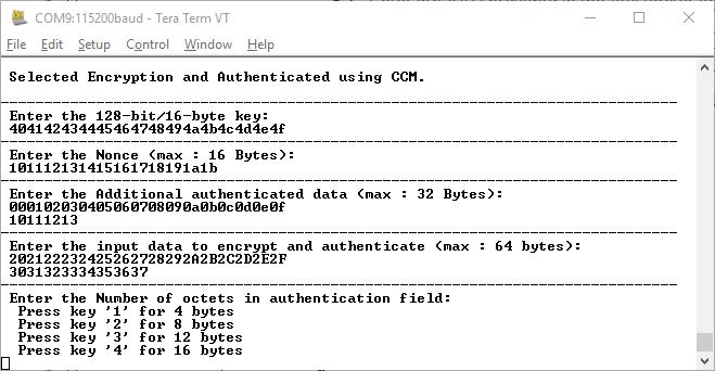 Authentication data. The result of the CCM AES encryption is printed on the Tera Term