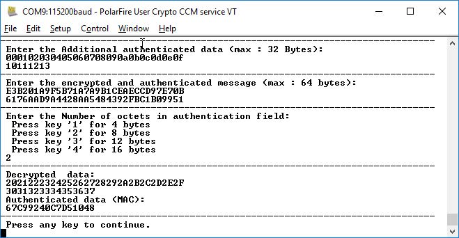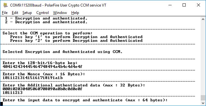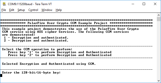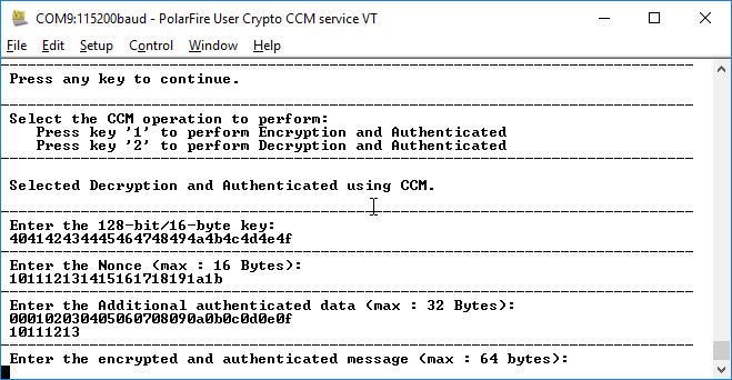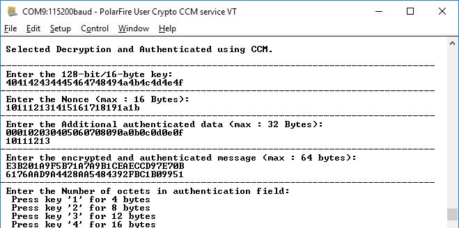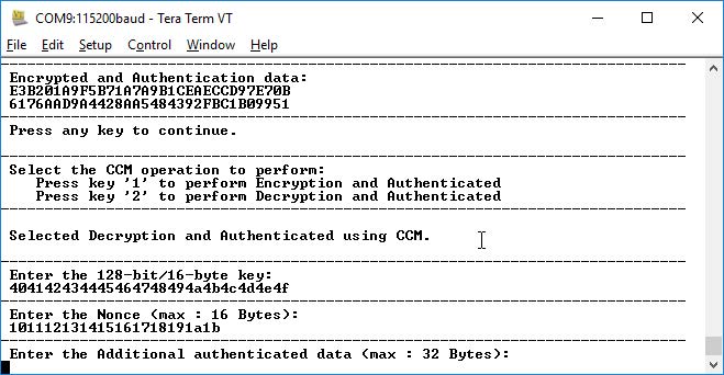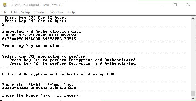 - Press '2' to perform AES CCM decryption using User Cryptoprocessor. The application prompts to enter 128-bit key.