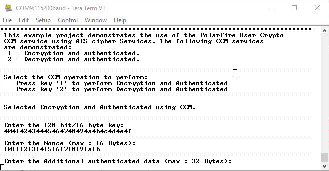 - Enter the AES key provided in the test vector and press Enter. The application prompts for Nonce.