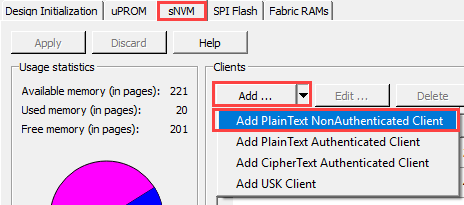 (Ask a Question)In this design, the AES key provided by the user is stored in the sNVM on page#4 using a system service call. Hence, a dummy client to clear the sNVM page needs to be added to the sNVM configurator. To add a dummy client, perform the following steps: