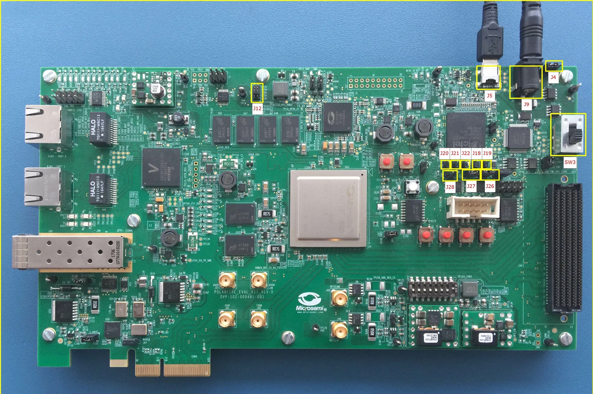 Table 5-1. Jumper Settings—Evaluation Board Jumper Description J18, J19, J20, J21, and J22 Close pin 2 and 3 for programming the PolarFire FPGA through FTDI J28 Close pin 1 and 2 for programming through the on-board FlashPro5 J26 Close pin 1 and 2 for programming through the FTDI SPI J27 Close pin 1 and 2 for programming through the FTDI SPI J23 Open pin 1 and 2 for programming SPI Flash J4 Close pin 1 and 2 for manual power switching using SW3 J12 Close pin 3 and 4 for 2.5 V  - Connect the power supply cable to the J9 connector on the evaluation board.