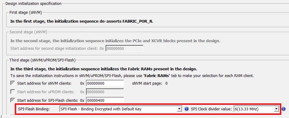 Important: The SPI clock divider value specifies the required SPI SCK frequency to read the initialization data from SPI Flash. The SPI Clock divider value must be selected based on the external SPI Flash operating frequency range.Table 4-3. SPI Clock Divider Value SPI Clock Divider Value SCK Frequency 1 80 MHz 2 40 MHz 4 20 MHz 6 13.3 MHz - Click Generate Initialization clients under the Design Initialization tab to generate the External SPI-Flash (Non-authenticated) client.