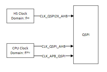 CLK_QSPI_APB, CLK_QSPI_AHB, and CLK_QSPI2X_AHB, respectively, are all synchronous, but can be divided by a prescaler and may run even when the module clock is turned off.