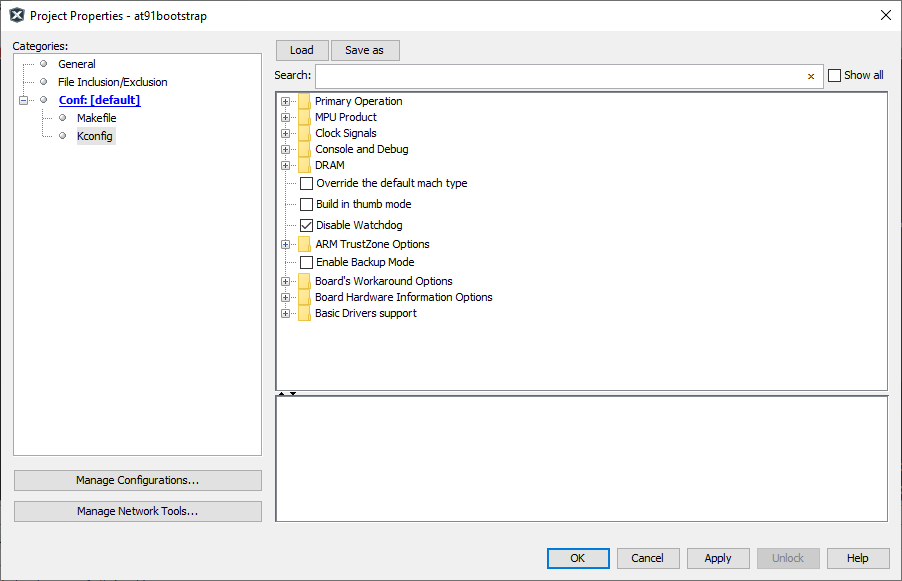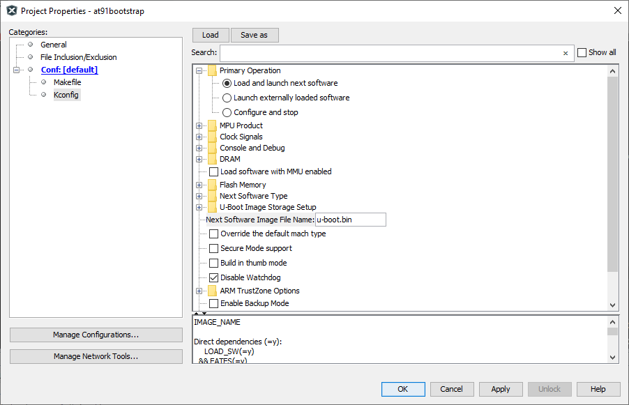 - Load {evaluation_kit}_bkpt_none_defconfig. For example, on SAM9X75 Evaluation Board, select sam9x75eb_bkptnone_defconfig as the configuration file.