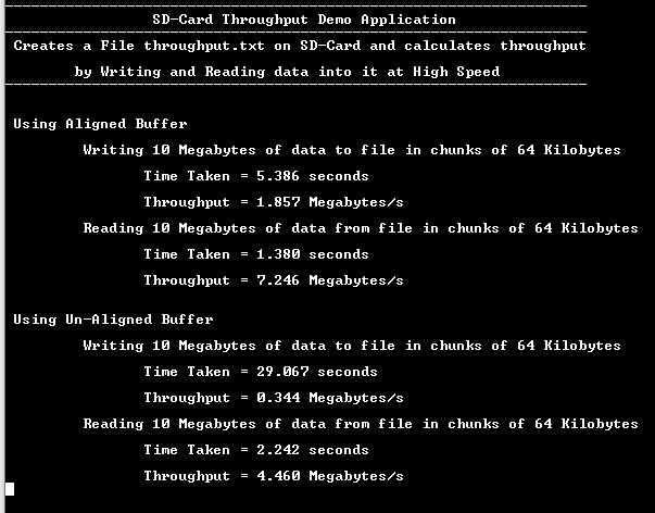 Application performs below filesystem operations and throughput calculations on SD-Card using both Aligned and Unaligned buffers: