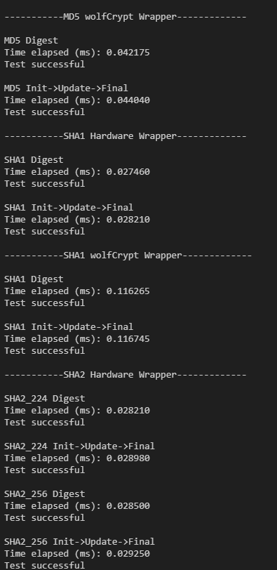 This demo application tests the functionality and performance the Crypto v4 library's API Hash hardware and software functions. Hardware and software selection is located inside the Crypto library in MCC.