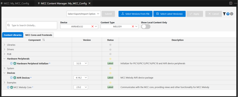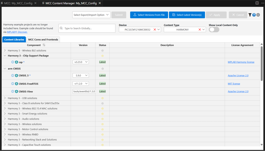 - In MPLAB® X IDE, the MCC Content Manager cannot be opened while MCC is running, as it may result in unexpected or corrupted content.