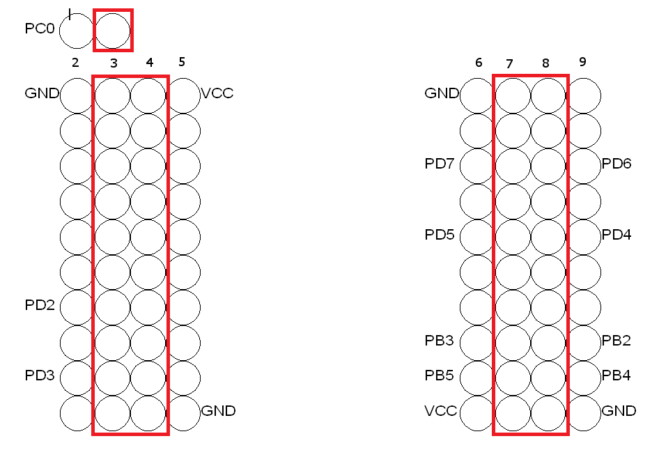 In the following figure, which pin that should be wired to which pin header is marked with the name of the pin. Note that even though the extension headers should be soldered to the bottom of the board, the drawings are from the top. To make the soldering process easier, it is recommended to solder the wires to the top of the board and to solder the wires before the extension headers.