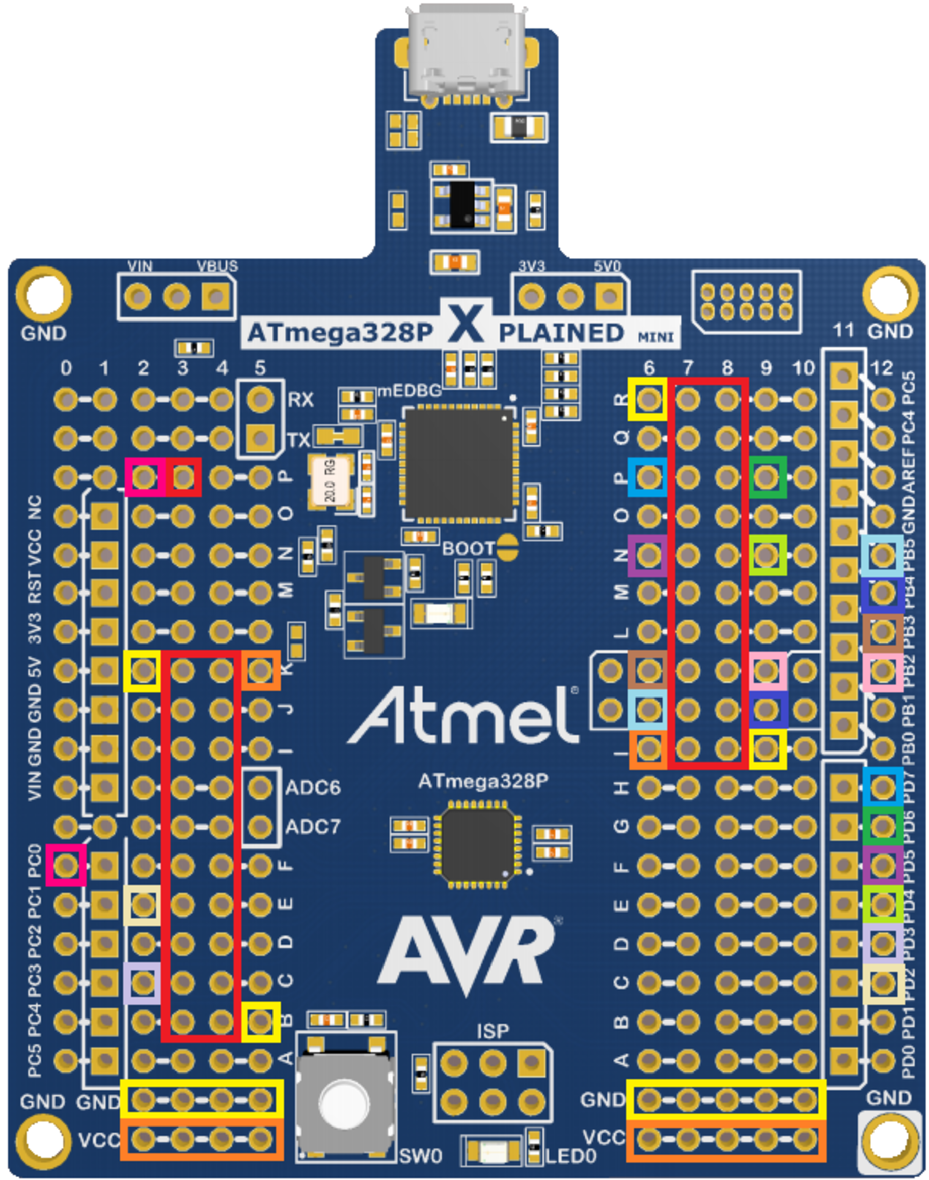 Two extension headers needs to be soldered to the Xplained Mini board. This should be 10ˣ2 angled 100 mil headers, and they must be soldered to the bottom of the board. The optional single pin header should be soldered to the top of the board.