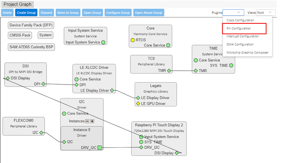 - For the MIPI DSI display, configure the pins listed in the following table to enable I2C and DSI communication. The Pin Manager interface in MCC allows visual assignment of pins to peripherals. Map the signals as required, based on the SAMA7D65-Curiosity board and the assignments shown in the following table.