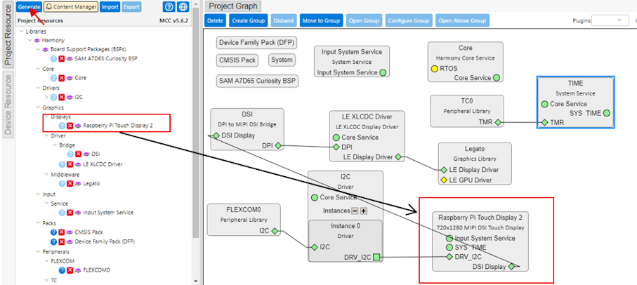 Relaunch MCC. Here, the Graphics > Displays > Raspberry Pi Touch Display 2 module is configured from the project resources in MCC. Connect the display with its dependencies and generate the code.