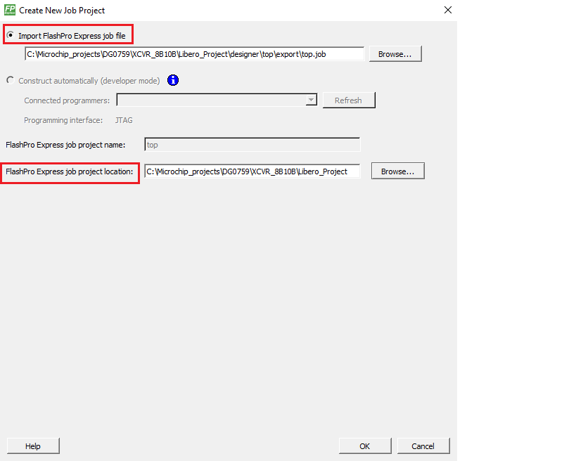 .jobfile is located and select the file. - FlashPro Express job project location: Click Browse and navigate to the location where you want to save the project.