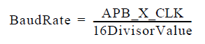In Asynchronous mode, the Baud Rate (BR) clock is generated by dividing the input reference clock's frequency (APB_0_CLK for MMUART_0 and APB_1_CLK for MMUART_1) by 16 and the integer plus fractional divisor value, as shown in the following equation.
