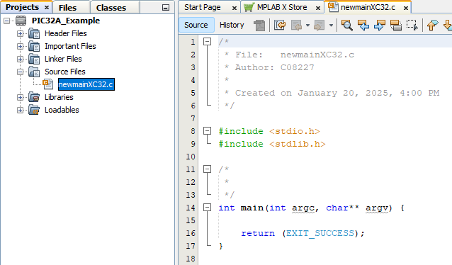 - Right click on the Source Files folder in the project tree. Select New > mainXC32.c to open the New mainXC32.c dialog to the Name and Location step.