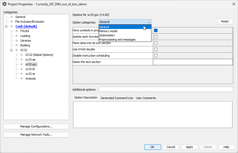 - From the MPLAB X IDE menu bar, select to open a window to set/check project build options.