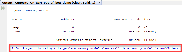 Additionally the memory usage report and link map file will generate a note about using a small data memory model if a large data memory model is specified but a small data memory model is sufficient. In this case, selecting a small data model will reduce code size.