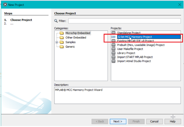 Create a New 32-bit MPLAB® Code Configurator (MCC) Harmony project.