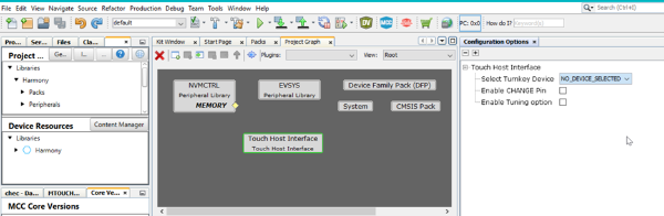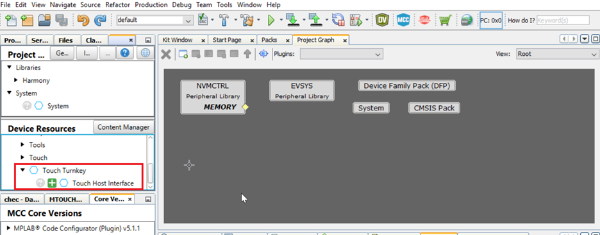 In the Device Resources tab of the Resource Management [MCC] tab, expand the Touch Turnkey library to find the Touch Host Interface component.