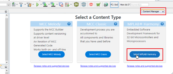 From the Content Manager, click the Select MPLAB Harmony button.