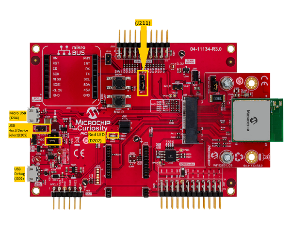 - Jumper J203 must be shorted between PB08 and VBUS (positions 2 and 3).