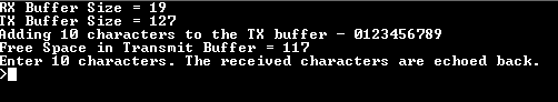- It then adds 10 characters, “0123456789”, to the transmit buffer and displays the available free space in the transmit buffer after the 10 characters have been added