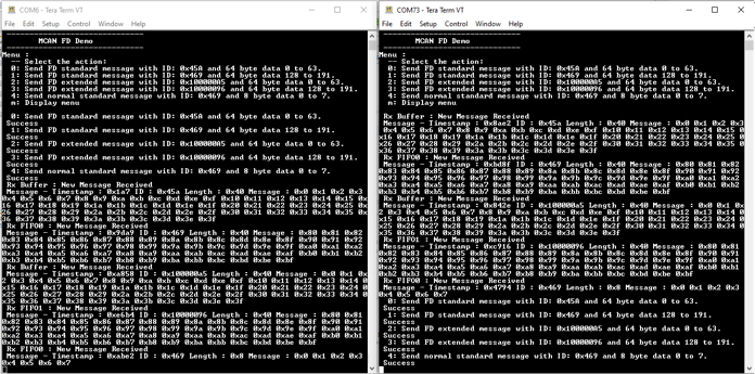 - In the console associated with board 1, press ‘0’ to transmit a CAN FD message.