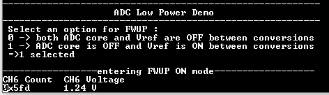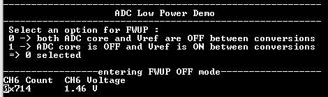 - Observe ADC entering Sleep mode with Fast Wake up OFF/ON. Console displays the ADC Count and the ADC Input Voltage.