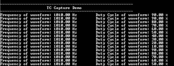 This example application shows how to use the TC module in Capture mode to measure duty cycle and frequency of an external input.