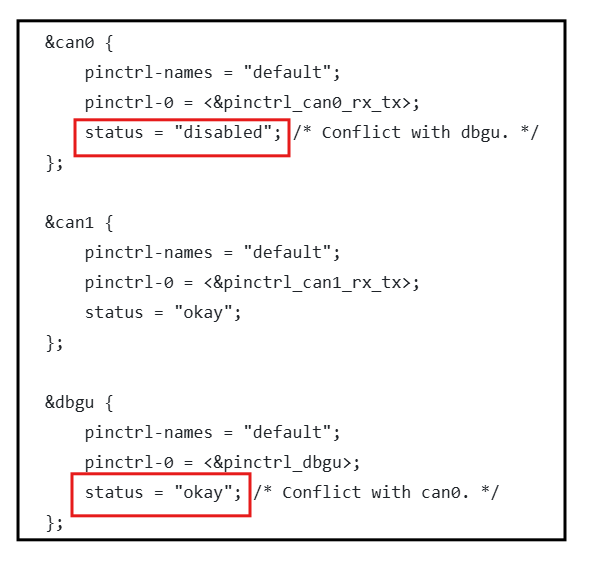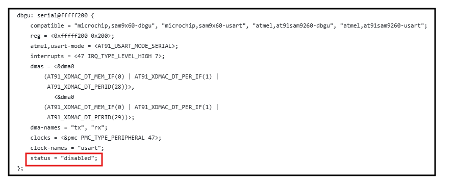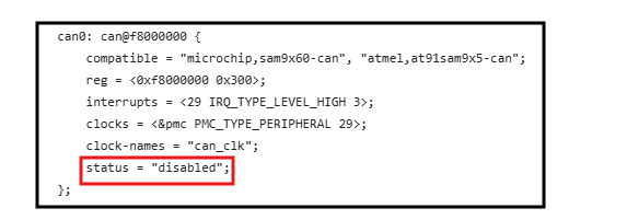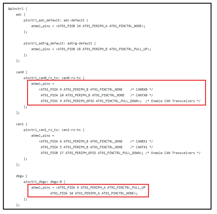 The following figure shows modifications that override the .dtsi file by disabling CAN0 and enabling only the DBGU functionality.