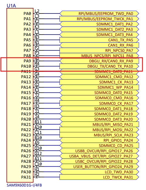 The schematic shows that CAN0 shares the same pin configuration as DBGU on pins PA9 and PA10. Therefore, to use DBGU as the serial console, CAN0 must be disabled in the board-specific Device Tree Source (.dts) file, and only the DBGU should be enabled.