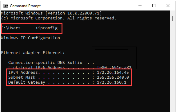 ipconfigcommand, and press the Enter key. - If your computer is connected to a network with a DHCP server, note the IP address