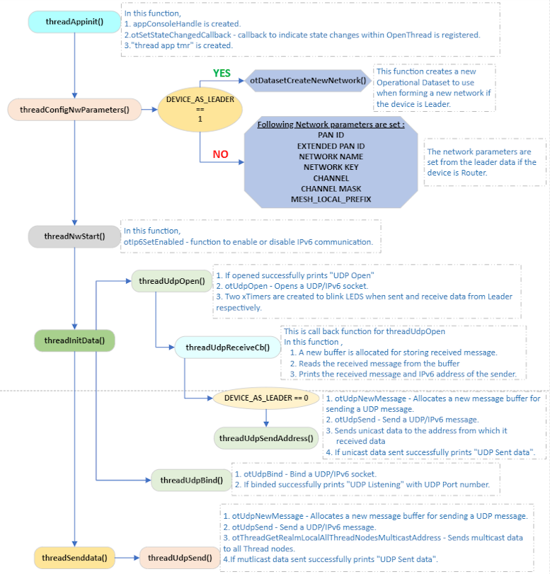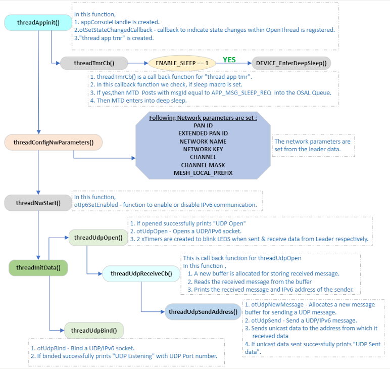 The following flowchart illustrates the functionality of the Demo UDP MTD Application. The flowchart covers both MED and SED.