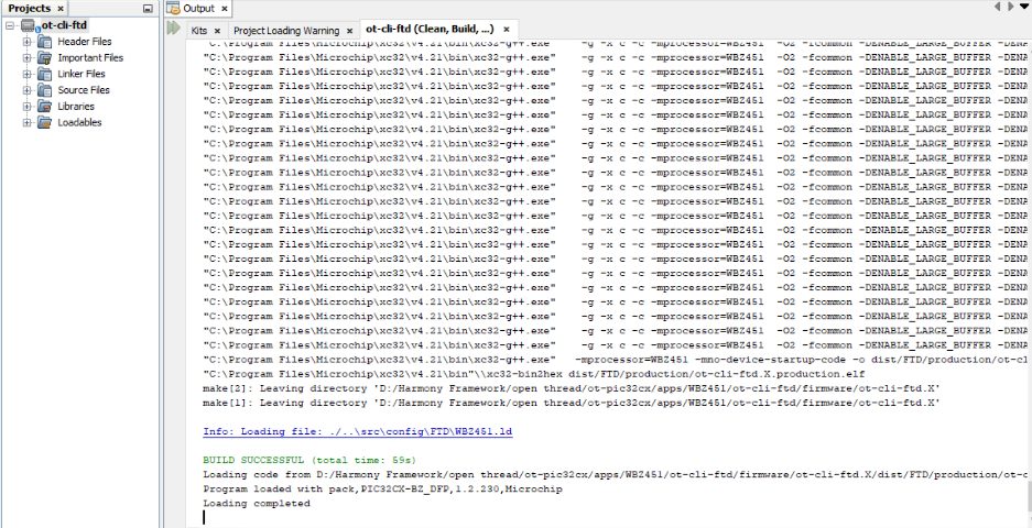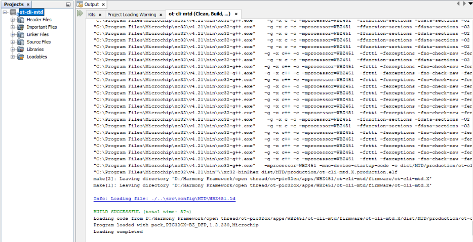 This section provides the setps for building and running projects. Please follow the instructions outlined in the "Creating a new MCC Harmony project" section and generate two projects. One project should have FTD as the device role, while the other should have MTD as the device role, with the CLI App included. The default settings can be used for all other configurations. Once the projects are created build the projects and build should be successful.