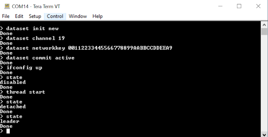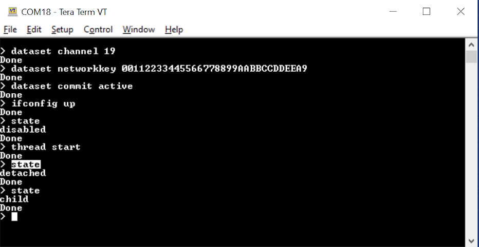 Node1: > dataset init new > dataset channel 19 > dataset networkkey 00112233445566778899AABBCCDDEEA9 > dataset commit active > ifconfig up > state > thread start > state - Once the above commands are executed