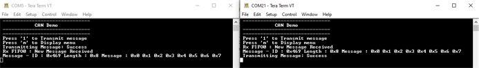 This application transmits CAN message to CAN Bus and receives CAN message from CAN Bus. To run this application, two evaluation boards of same type are required. These boards acts as different nodes on the CAN bus. Same application is programmed onto both the boards. Boards are connected to PC via UART. While running the application, user can send and receive CAN messages between the boards using UART console applications running on the PC.