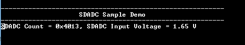 In this application, the DAC output is fed to an analog input for the SDADC conversion. An analog input is converted by a software trigger and the converted value is displayed on the console. DAC output is changed by 0.1V upon switch press. The SDADC sample output is between 0.0V to 3.3V and it starts from 1.65V when device is reset.