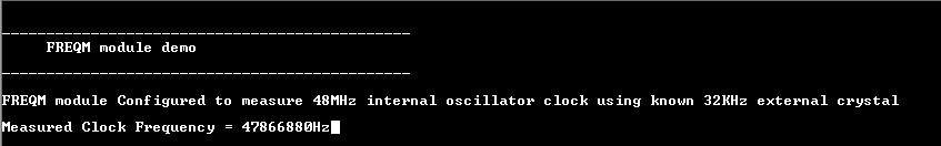 This example application demonstrates how to use the FREQM peripheral to measure the frequency of the internal RC Oscillator.