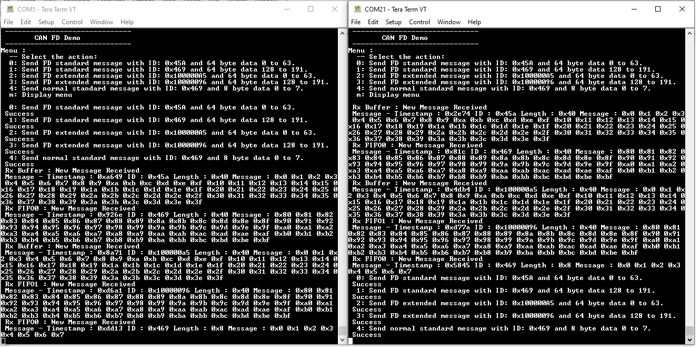 - In the console associated with board 1, press “0” to transmit a CAN FD message