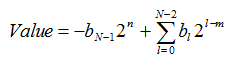 The binary representation of an N-bit (m+n+1 bits) number in Qn.m is shown in Figure 1. The value is given by the equation shown in Figure 2.