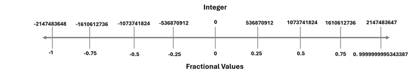 For example, the 32-bit integer range [-2147483648, +2147483647] format maps to the Q31 range of [-1, 0.99999999954343387]. The following figure shows the mapping between these formats.