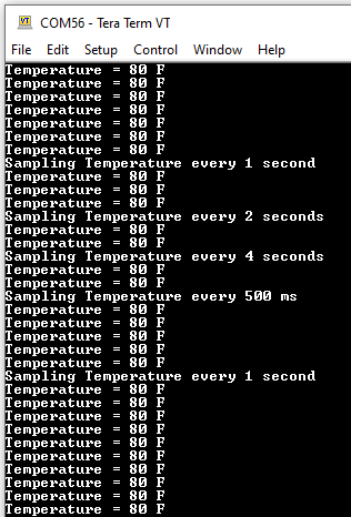 - While the temperature sampling rate changes on every switch S1 press, notice LED1 toggling at the same sampling rate