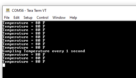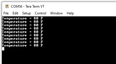 temperature values (in °F) being displayed on the terminal every 500
