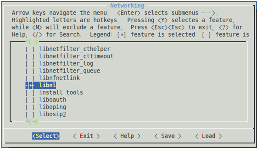 Target package>Libraries>Networking, then selectlibnl.Figure 3-7. menuconfig: Enable libnl