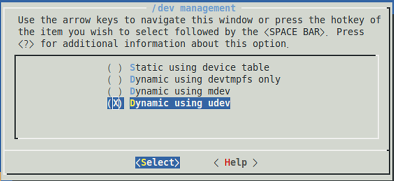 $ make menuconfigcommand. - Enable dynamic/dev management