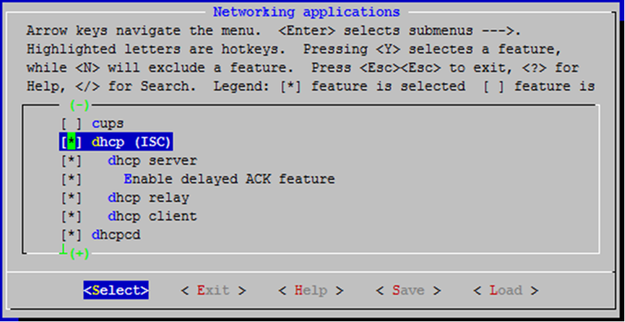 Target package>Networking applications, then selectdhcp.Figure 3-6. menuconfig: Enable dhcp