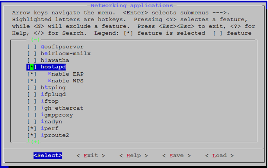 Target package>Networking applications, then selecthostapd.Figure 3-4. menuconfig: Enable hostapd