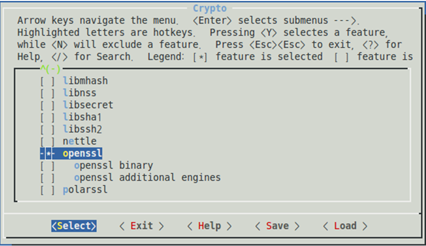 Target packages>Libraries, then selectCrypto.Figure 3-8. menuconfig: Enable openssl